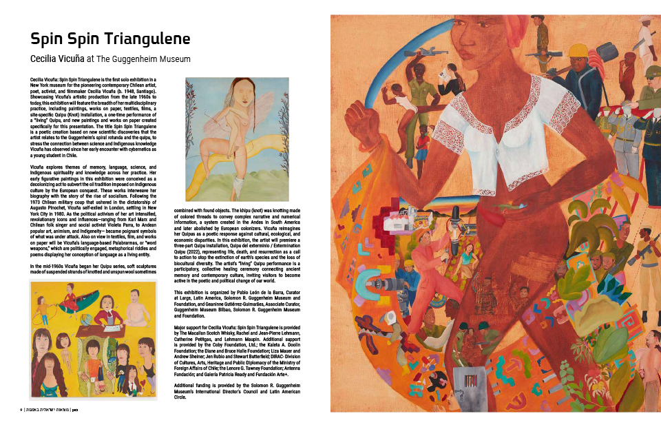 Cecilia Vicu?a: Spin Spin Triangulene is the first solo exhibition in a New York museum for the pioneering contemporary Chilean artist, poet, activist, and filmmaker Cecilia Vicu?a (b. 1948, Santiago). Showcasing Vicu?a’s artistic production from the late 1960s to today, this exhibition will feature the breadth of her multidisciplinary practice, including paintings, works on paper, textiles, films, a site-specific Quipu (Knot) installation, a one-time performance of a “living” Quipu, and new paintings and works on paper created specifically for this presentation. The title Spin Spin Triangulene is a poetic creation based on new scientific discoveries that the artist relates to the Guggenheim’s spiral rotunda and the quipu, to stress the connection between science and Indigenous knowledge Vicu?a has observed since her early encounter with cybernetics as a young student in Chile. Vicu?a explores themes of memory, language, science, and Indigenous spirituality and knowledge across her practice. Her early figurative paintings in this exhibition were conceived as a decolonizing act to subvert the oil tradition imposed on Indigenous culture by the European conquest. These works interweave her biography with the story of the rise of socialism. Following the 1973 Chilean military coup that ushered in the dictatorship of Augusto Pinochet, Vicu?a self-exiled in London, settling in New York City in 1980. As the political activism of her art intensified, revolutionary icons and influences—ranging from Karl Marx and Chilean folk singer and social activist Violeta Parra, to Andean popular art, animism, and Indigeneity— became poignant symbols of what was under attack. Also on view in textiles, film, and works on paper will be Vicu?a’s language-based Palabrarmas, or “word weapons,” which are politically engaged, metaphorical riddles and poems displaying her conception of language as a living entity. In the mid-1960s Vicu?a began her Quipu series, soft sculptures made of suspended strands of knotted and unspun wool sometimes combined with found objects. The khipu (knot) was knotting made of colored threads to convey complex narrative and numerical information, a system created in the Andes in South America and later abolished by European colonizers. Vicu?a reimagines her Quipus as a poetic response against cultural, ecological, and economic disparities. In this exhibition, the artist will premiere a three-part Quipu installation, Quipu del exterminio / Extermination Quipu (2022), representing life, death, and resurrection as a call to action to stop the extinction of earth’s species and the loss of biocultural diversity. The artist’s “living” Quipu performance is a participatory, collective healing ceremony connecting ancient memory and contemporary culture, inviting visitors to become active in the poetic and political change of our world. This exhibition is organized by Pablo Le?n de la Barra, Curator at Large, Latin America, Solomon R. Guggenheim Museum and Foundation, and Geaninne Guti?rrez-Guimar?es, Associate Curator, Guggenheim Museum Bilbao, Solomon R. Guggenheim Museum and Foundation. Major support for Cecilia Vicu?a: Spin Spin Triangulene is provided by The Macallan Scotch Whisky, Rachel and Jean-Pierre Lehmann, Catherine Petitgas, and Lehmann Maupin. Additional support is provided by the Coby Foundation, Ltd.; the Kaleta A. Doolin Foundation; the Diane and Bruce Halle Foundation; Liza Mauer and Andrew Sheiner; Jen Rubio and Stewart Butterfield; DIRAC- Division of Cultures, Arts, Heritage and Public Diplomacy of the Ministry of Foreign Affairs of Chile; the Lenore G. Tawney Foundation; Antenna Fundaci?n; and Galer?a Patricia Ready and Fundaci?n Arte+. Additional funding is provided by the Solomon R. Guggenheim Museum’s International Director’s Council and Latin American Circle. Read more ![]() |