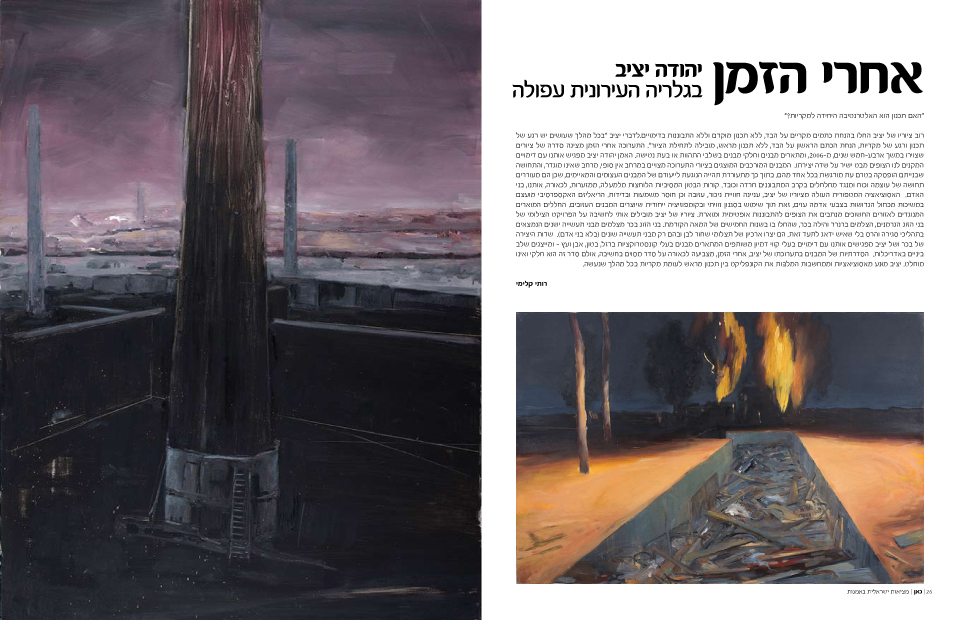 רוב ציוריו של יציב החלו בהנחת כתמים מקריים על הבד, ללא תכנון מוקדם וללא התבוננות בדימויים.לדברי יציב “בכל מהלך שעושים יש רגע של תכנון ורגע של מקריות, הנחת הכתם הראשון על הבד, ללא תכנון מראש, מובילה לתחילת הציור”. התערוכה אחרי הזמן מציגה סדרה של ציורים שצוירו במשך ארבע-חמש שנים, מ-2006, ומתארים מבנים וחלקי מבנים בשלבי התהוות או בעת נטישה. האמן יהודה יציב מפגיש אותנו עם דימויים המקנים לנו הצופים מבט ישיר על שדה יצירתו. המבנים המורכבים המוצגים בציורי התערוכה מצויים במרחב אין סופי, מרחב שאינו מוגדר, והתחושה שבנייתם הופסקה בטרם עת מודגשת בכל אחד מהם. בתוך כך מתעוררת תהייה הנוגעת לייעודם של המבנים העצומים והמאיימים, שכן הם מעוררים תחושה של עוצמה וכוח ומנגד מחלחלים בקרב המתבוננים חרדה וכובד. קורות הבטון המסיביות הלוחצות מלמעלה, ממזערות, לכאורה, אותנו, בני האדם. האסוציאציה המטפורית העולה מציוריו של יציב, עניינה חוויית ניכור, עזובה וכן חוסר משמעות ובדידות. הריאליזם האקספרסיבי מועצם במשיכות מכחול הגדושות בצבעי אדמה עזים, זאת תוך שימוש בסגנון זוויתי ובקומפוזיציה ייחודית שיוצרים המבנים העזובים. החללים המוארים המנוגדים לאזורים החשוכים מנתבים את הצופים להתבוננות אופטימית ומוארת. ציוריו של יציב להמשך קריאה